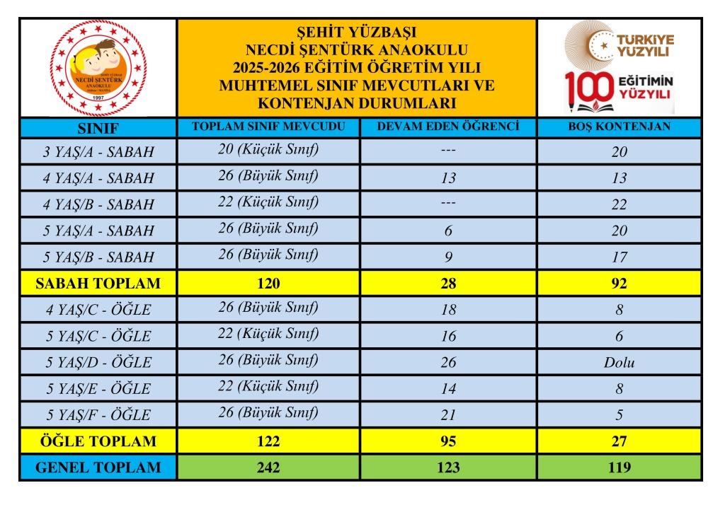 SAYIN VELİLERİMİZ VE VELİ ADAYLARIMIZ; 2025-2026 EĞİTİM ÖĞRETİM YILI MUHTEMEL SINIF MEVCUTLARIMIZ VE BOŞ KONTENJANLARIMIZ AŞAĞIDA SUNULMUŞTUR.